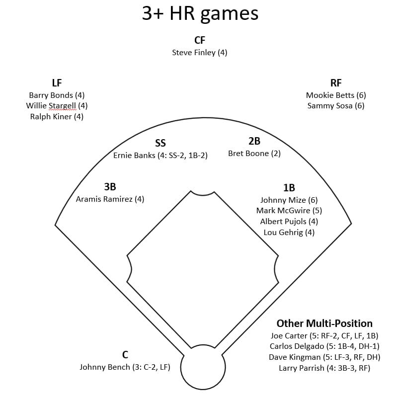 Going back to the regular season records, in the AL and NL, three or more HRs have been hit in a game over 650 times. Current superstar Mookie Betts has done it six times, which is tied with Sammy Sosa and Johnny Mize for the most all-time. Here are the players who have hit three or more HR in a game the most in the regular season at each position: