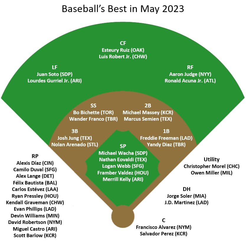 The second full month of the 2023 season ended recently, so I'm a few days late in getting this article out. But who were the all-stars for the month of May? Given the increased level of interleague play, unlike the real All-Star game in July I'm not going to separate selections by league. So for overall MLB, for the month of May, here is what I came up with: