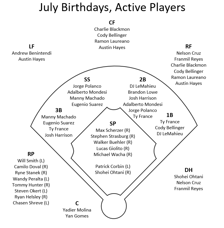 Daulton Varsho of the Diamondbacks was born on July 2nd, and would be an intriguing addition to this roster given his rare position combination of C and CF. Nathaniel Lowe and Jared Walsh are two more 1B who could one day crack this roster. And Pirates rookie LF Jack Suwinksi is only batting .227, but already has 14 HR in 62 games.