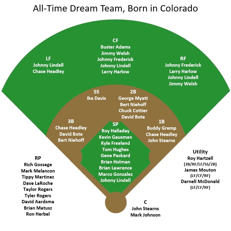 Important caveat to what follows: I’m creating these all-time dream teams based on the birthplace data available at baseball-reference.com. I realize this might mean some players will appear for a state’s all-time dream that seems odd, e.g., a player who was born in one state but lived there only briefly, while then spending most of his youth, or especially critical years playing baseball in high school in another state. So that is an important caveat to the below dream team roster—and I’ll discuss the players that I know went to high school in a state other than Colorado towards the end of this article (and vice-versa, those born elsewhere but who went to high school in Colorado.)