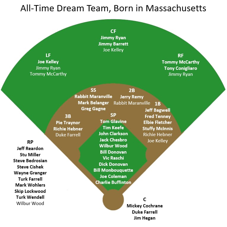Important caveat to what follows: I’m creating these all-time dream teams based on the birthplace data available at baseball-reference.com. I realize this might mean some players will appear for a state’s all-time dream that seems odd, e.g., a player who was born in one state but lived there only briefly, while then spending most of his youth, or especially critical years playing baseball in high school in another state. So that is an important caveat to the below dream team roster—and I’ll discuss the players that I know went to high school in a state other than Massachusetts towards the end of this article (and vice-versa, those born elsewhere but who went to high school in Massachusetts.)