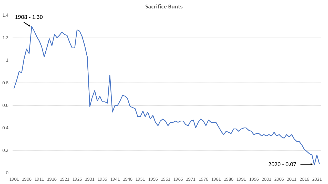 Here the floor has completely fallen out. This rate was between 0.30 and 0.49 every year from 2012 back to 1957 (and much higher before that). But it has declined every year since 2012, except for a relative bounce back in 2021. In 2022 the rate was a mere 0.08, barely higher than the all-time low of 0.07 in 2020. Some might bemoan the lack of stolen bases, but it is bunting that has nearly vanished from the game.