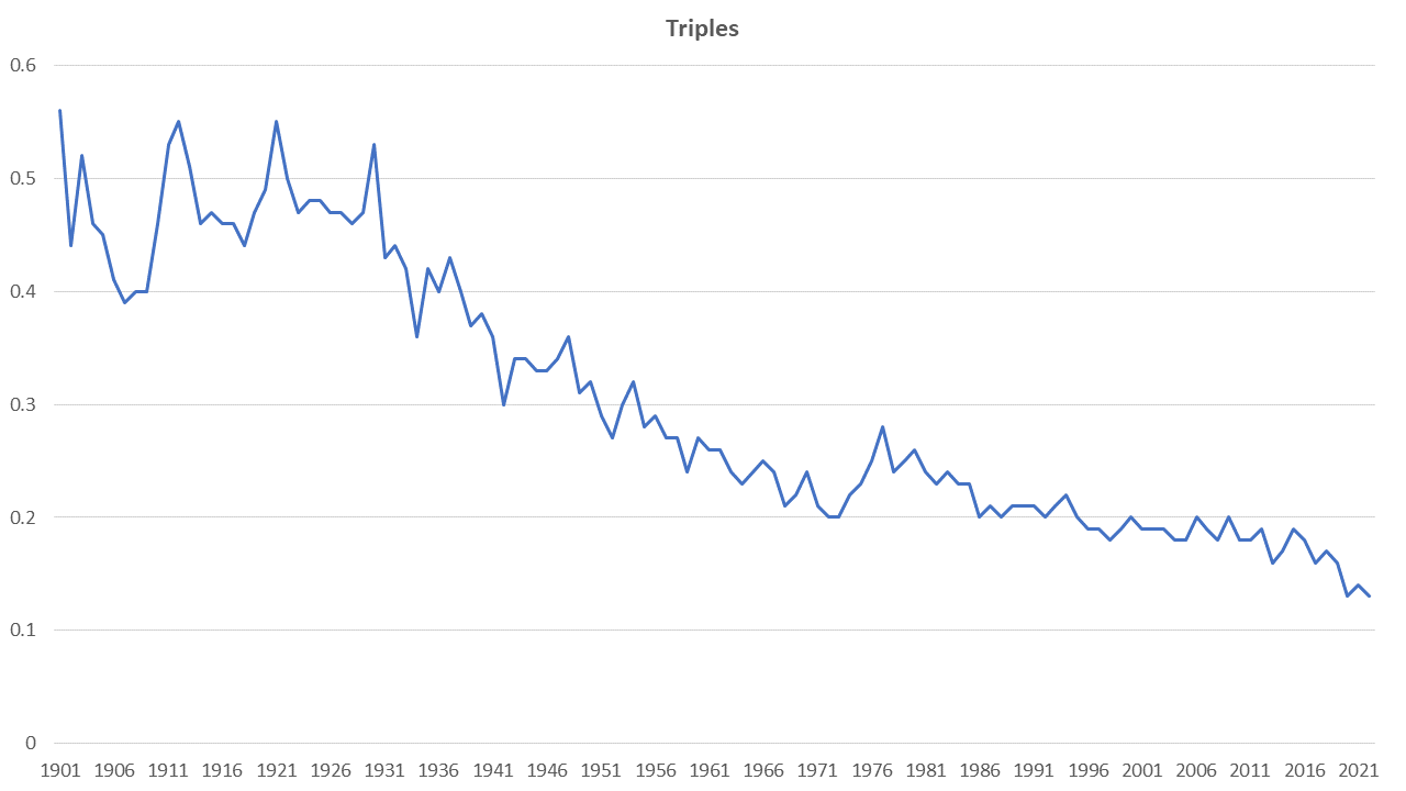 More interesting here is that 2022 set a new record for the lowest rate of triples. The 0.132 rate was lower than the 2020 record low of 0.134. 2022 also joined 2021 as the only (full) seasons where no player managed to hit double-digit triples. Amed Rosario led MLB with 9 this year, while three players led with only 8 apiece in 2021 (Shohei Ohtani, David Peralta, and Bryan Reynolds).
