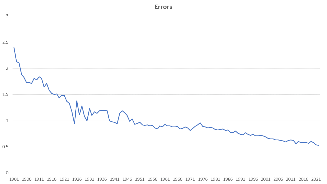 I'm not going to delve into fielding statistics too far, but it seems worth celebrating that the rate of errors per team per game hit an all-time low of 0.53 in 2022, just barely below the 0.54 level of 2021. That figure was 0.70 or higher every year prior 2001, and over 0.80 every year prior to 1987.