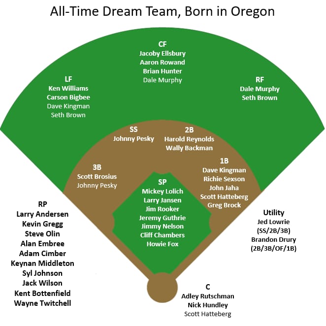 Important caveat to what follows: I’m creating these all-time dream teams based on the birthplace data available at baseball-reference.com. I realize this might mean some players will appear for a state’s all-time dream that seems odd, e.g., a player who was born in one state but lived there only briefly, while then spending most of his youth, or especially critical years playing baseball in high school in another state. So that is an important caveat to the below dream team roster—and I’ll discuss the players that I know went to high school in a state other than Oregon towards the end of this article (and vice-versa, those born elsewhere but who went to high school in Oregon.)