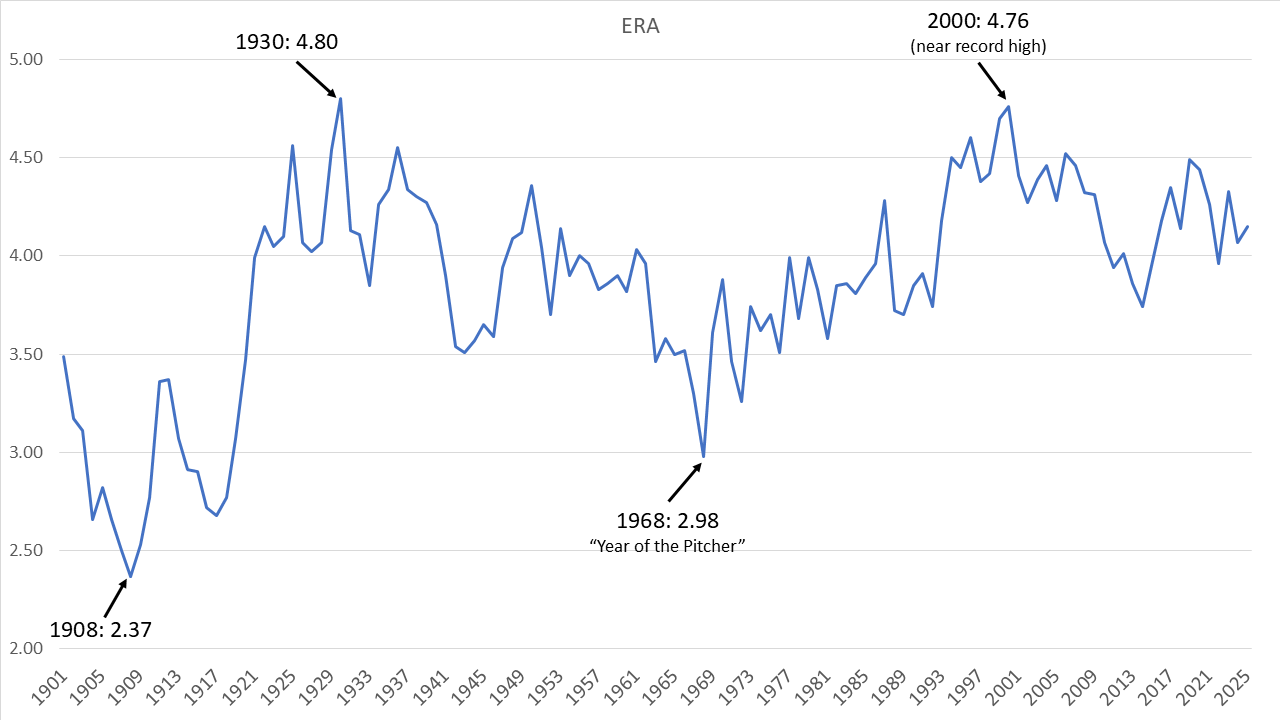 Closely related to total runs scored is of course pitching ERA (not all runs are “earned", but as you can see from the chart above, the historical graph here has similar highs and lows.) In 2025 the average ERA across all 30 teams was 4.15, up a bit from 2024 (4.07), but lower than the 4.33 mark from 2023.