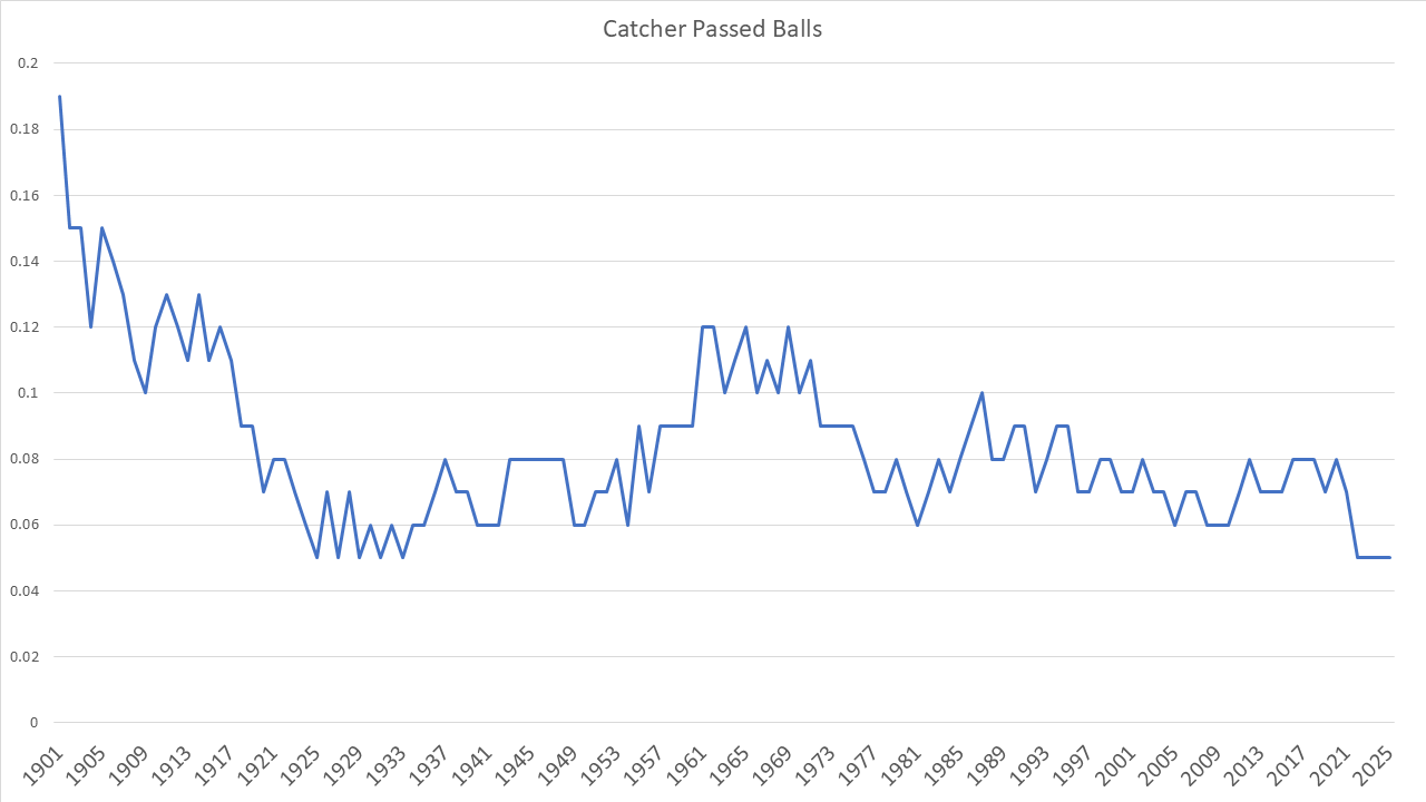 Lastly... as noted earlier, catchers have hit new record lows in throwing out baserunners the past two years. Where catchers have done better is in not allowing passed balls. The rate of only 0.05 per team, per game is the same record low we saw in 2022-2024 (and also in several years from 1925-1933). What might see this change dramatically? More knuckleball pitchers!