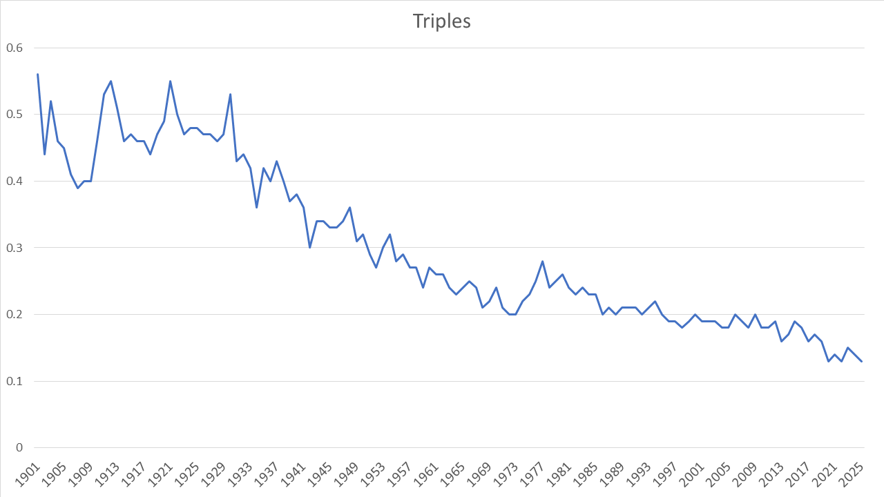 Serious baseball fans know that there used to be a lot more triples hit by batters—especially in the era before Babe Ruth led the surge in HR. As the chart above shows, we are essentially at the end of a longstanding trend downwards. For fans of triples, in 2024 we did had four players with 10+ triples for the first time since 2019. And then in 2025 we had five such players, with Corbin Carroll leading with 17—the most since José Reyes had 19 in 2008.