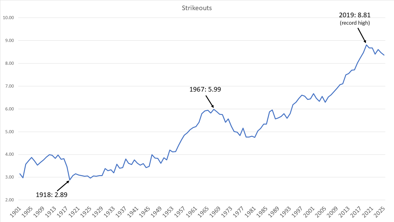 While triples and sacrifice bunts have long been trending downward, strikeouts have generally been trending up for many years. In 2025 there were 8.36 strikeouts per team, per game. That is less than the 8.48 in 2024, and actually the lowest rate since the 8.25 we had in 2017. The all-time high of 8.81 came in 2019, but the chart above shows only a slight trend downwards since then.
