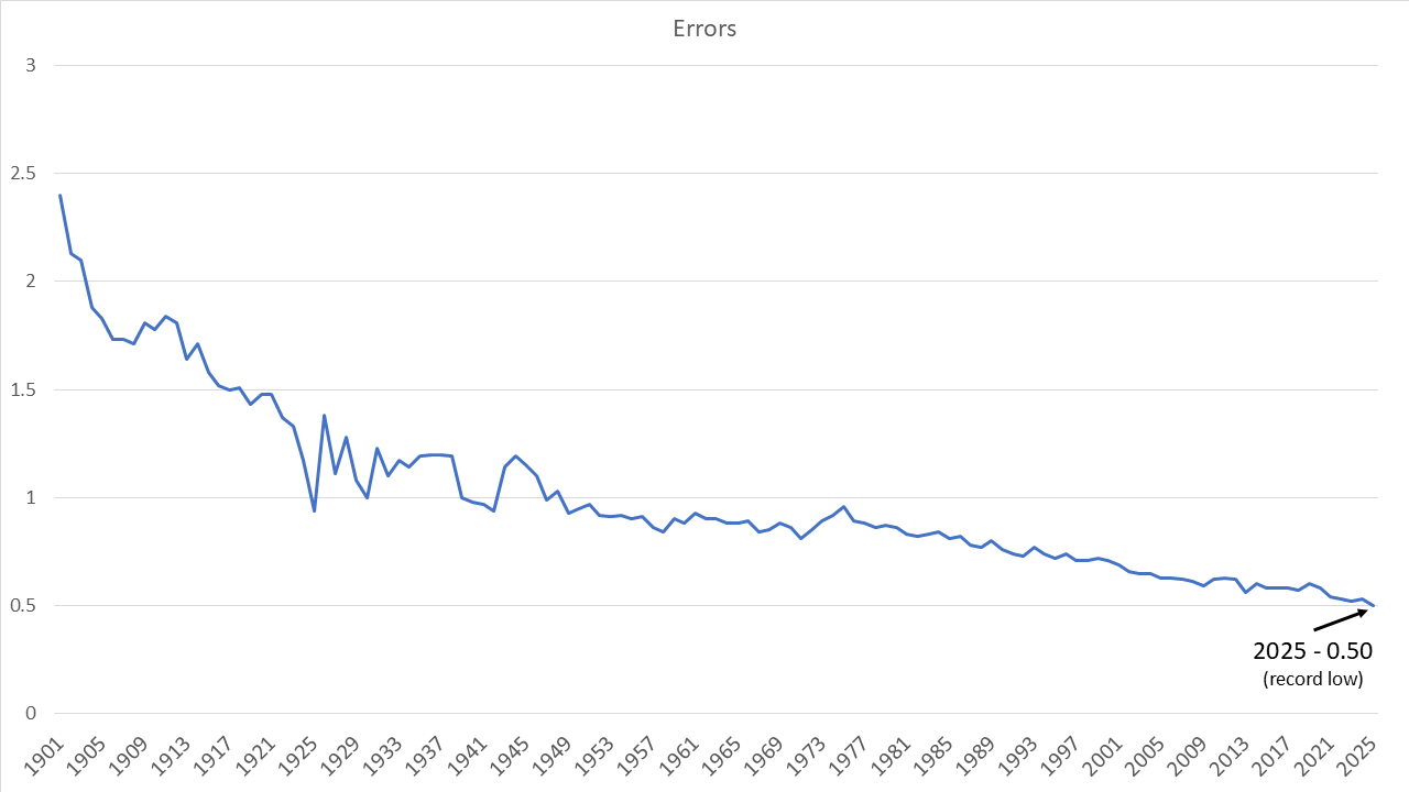 I'm not going to delve into fielding statistics too far, but it seems worth celebrating that the rate of errors per team, per game reached a new all-time low in 2025! The rate was 0.50, which is a bit lower than the 0.52-0.53 rates from the previous three years. For comparison, that figure was 0.70 or higher every year prior 2001, and over 0.80 every year prior to 1987.