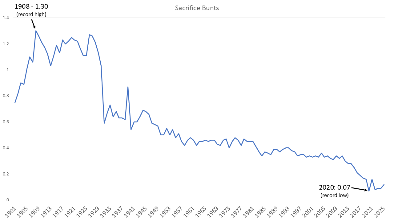 Like triples, another part of the game that has seen a long decline is sacrifice bunts. Far more common in the early 1900s, after the rise of HRs in the 1920s and 1930s, the bunt started a long downward trend leading to a new record low of 0.07 per team, per game in the COVID-shortened 2020 season. With pitchers no longer hitting in the NL, I wouldn’t predict a change in this area for a while (if ever.)