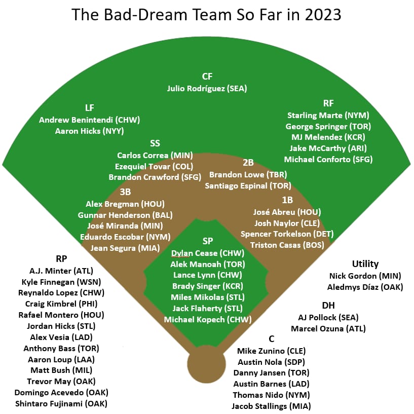 But what about a “Bad Dream” team, or dare we say “Nightmare” team? As we are almost one-quarter the way through the 2023 regular season, here are the players that I think are off to the worst starts—relative to expectations, which I admit is subjective and can vary, and not including players who have not met expectations largely due to injuries. (Note: For position players, this is based on their hitting only—some of them might be doing fine defensively.)