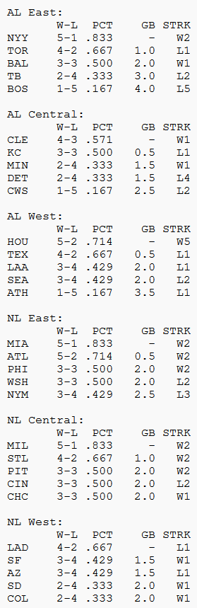 Here are the current MLB standings, with thanks to the website Plain Text Sports for the formatting. (See also the official, more detailed standings at MLB here.)