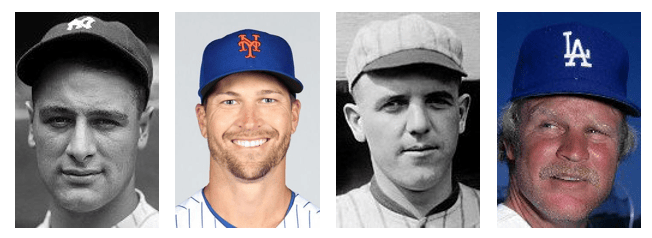 Lou Gehrig (1903) is a Hall of Famer and often considered the greatest 1B of all time. He played all of his 17-year career with the New York Yankees, and would have played longer if not for the progressive neurodegenerative disease named Amyotrophic Lateral Sclerosis (ALS), which came to be known as Lou Gehrig’s disease. Nicknamed the Iron Horse, he famously had the longest consecutive games played streak (2,130), only broken decades later by Cal Ripken. A power hitter who batted cleanup behind Babe Ruth for the “Murderers Row” Yankees of the late 20s and early 30s, Gehrig led the AL in HR three times and RBI five times, including a still AL-record high of 185 RBI in 1931. He won the AL Triple Crown in 1934 when he hit 49 HR with 166 RBI and a .363 average. He also led the AL in runs scored four times, doubles twice, triples once, and walks three times. He was AL MVP twice, in 1927 and 1936, and came in the top five another seven times. Overall for his career Gehrig had 493 HR, 1,888 runs, 1,995 RBI, a .340/.447/.632 slash line, and a 179 OPS+. He starred in the postseason also, hitting 10 HR in 34 World Series games, with an impressive .361/.483/.731 slash line in 150 plate appearances.