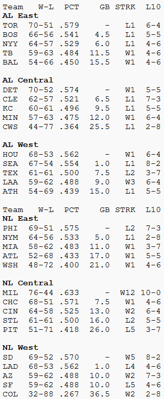 I am providing current standings as part of The Baseball Buffet, with the image being a modified version of the text-based standings at Plain Text Sports. Here also is a link to the official standings at MLB.com.